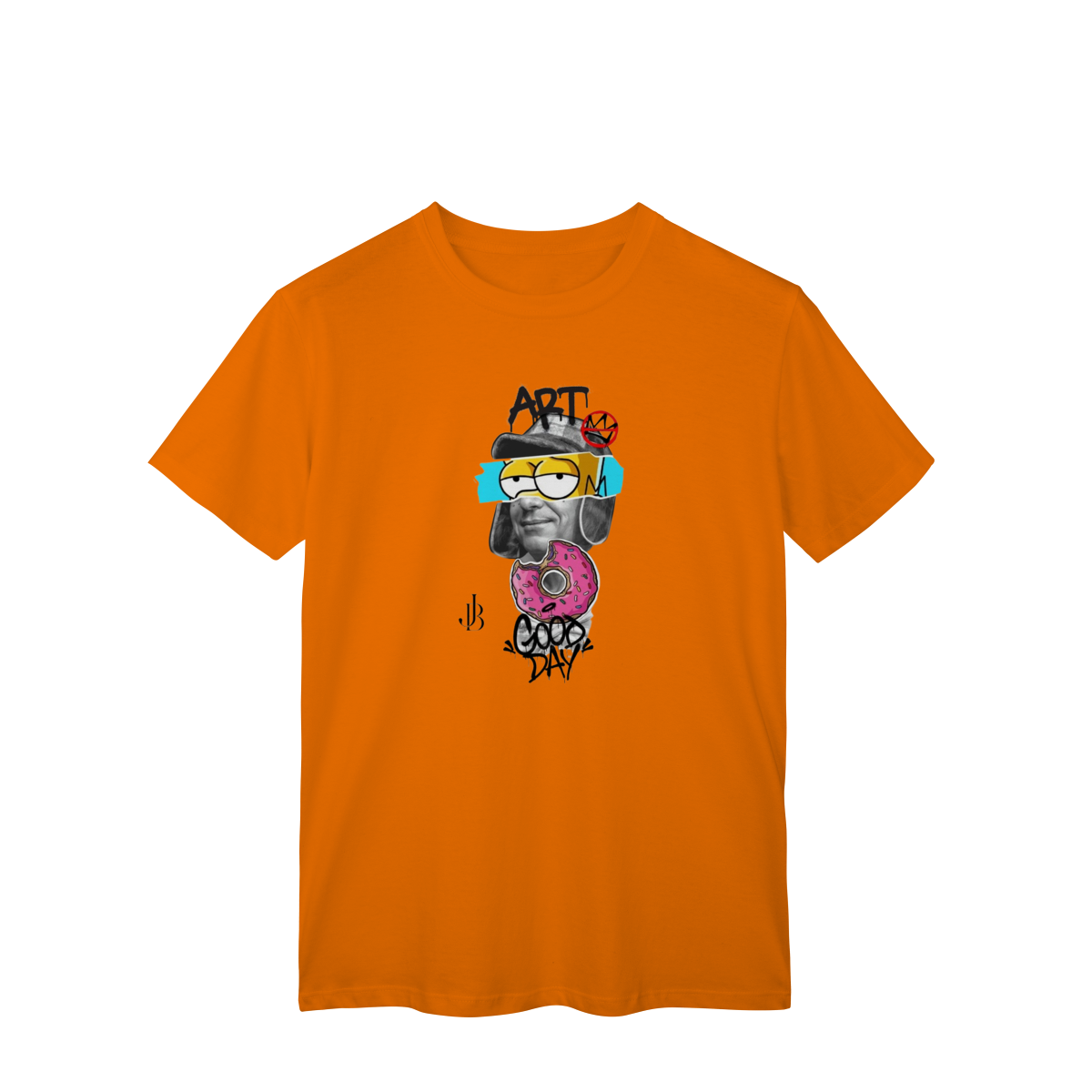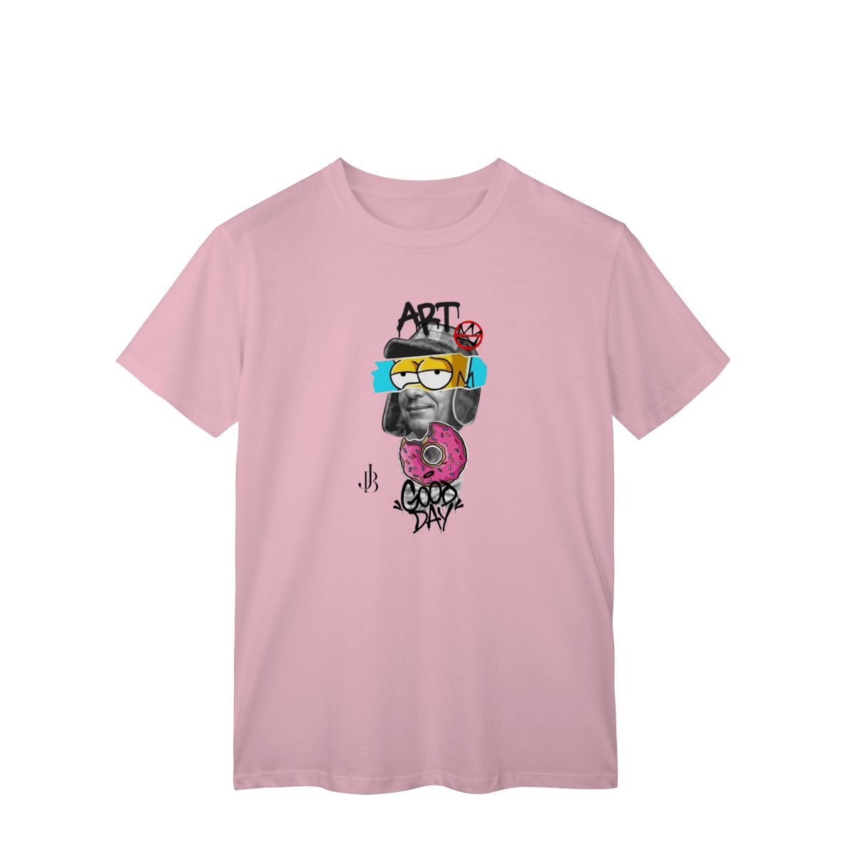 A camiseta “Art Good Day” traz uma proposta ousada e artística, com uma colagem moderna que mistura elementos visuais como ilustração, fotografia e grafite. O destaque fica no rosto estilizado com referências pop, detalhes coloridos e o toque irreverente do donut, criando uma estética única e fora do comum.